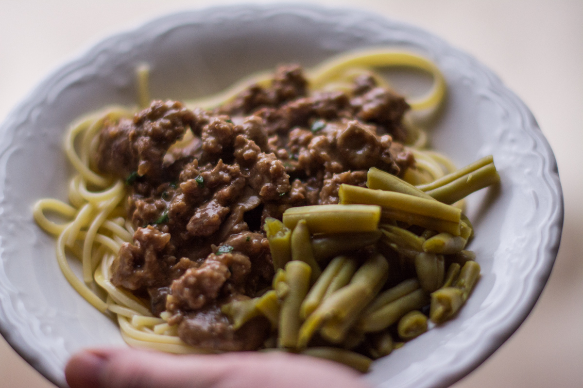 Sunday: Dan Dan Noodles (w/ added mushrooms) + Green Beans (canned)